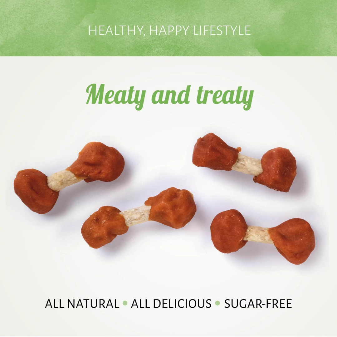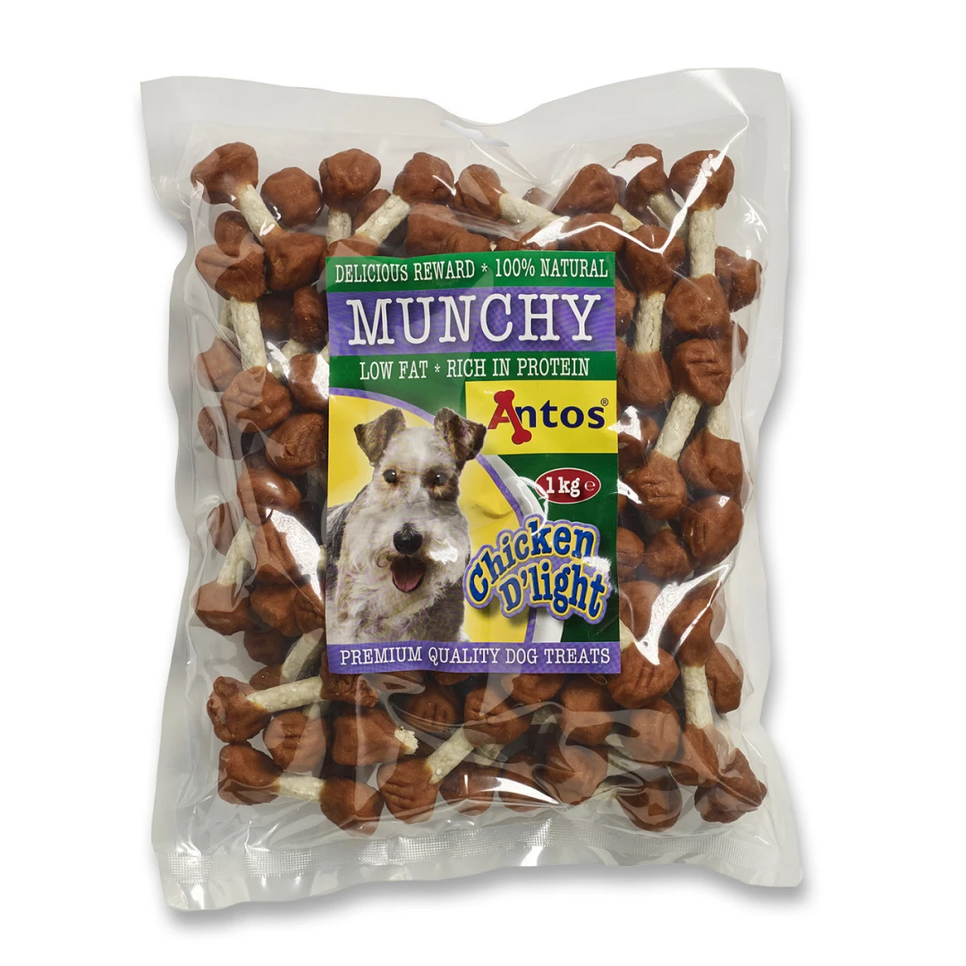 Antos Chicken D’Light, gemaakt van 100% kip en is een verantwoorde en vooral lekkere beloning voor honden. Chicken D’light Munchy bestaat uit een crunchy runderhuid staafje met extra veel kippenvlees eromheen gewikkeld.