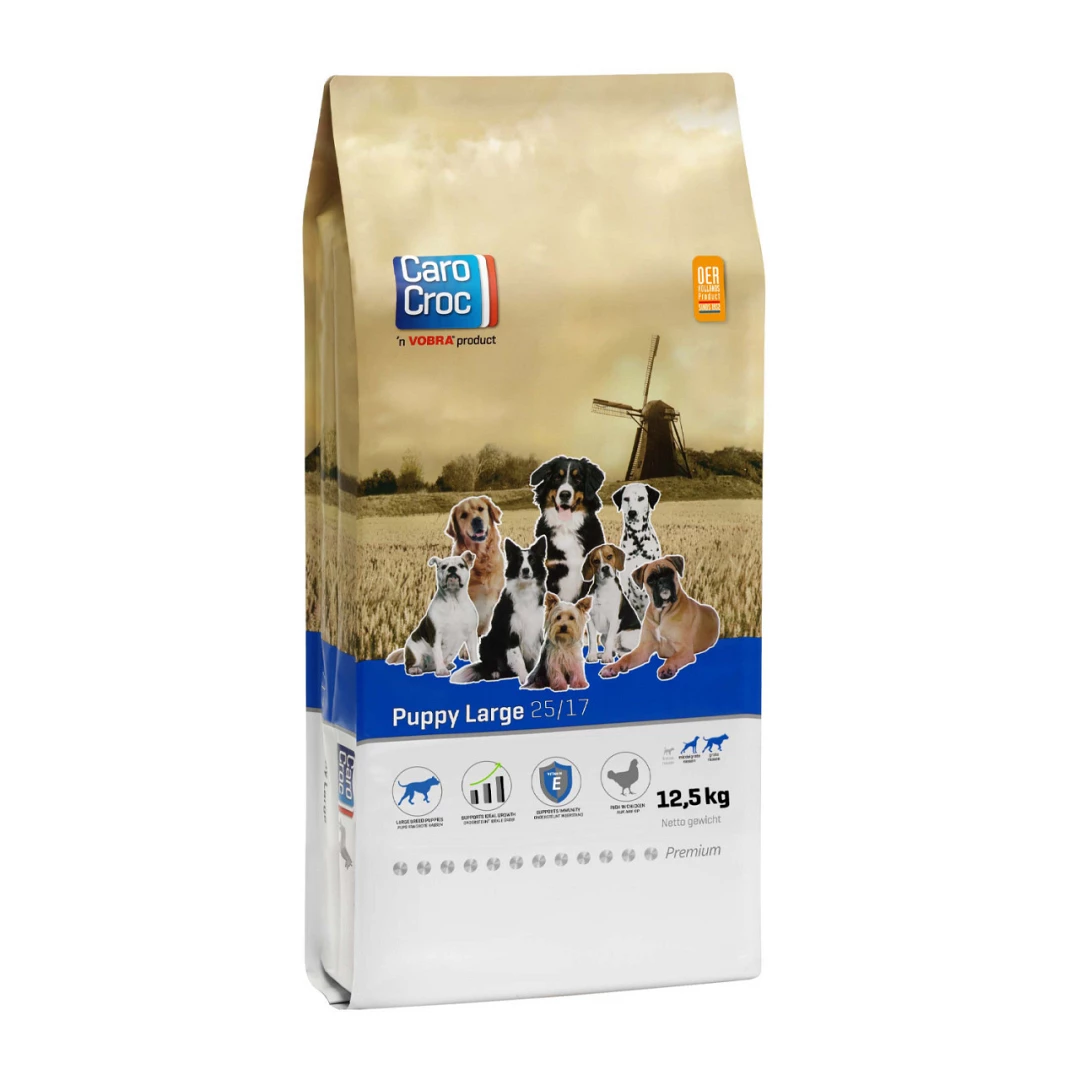 CaroCroc Puppy Large 25/17 is een volledige voeding voor pups van grote rassen. Evenwichtige voeding vormt, met name bij middelgrote tot grote rassen, een belangrijke basis voor jonge, opgroeiende honden. CaroCroc Puppy Large verzekert je van een goede groei en ontwikkeling van jouw hond. Het bevat alle bouwstoffen, in de juiste verhouding, die je pup of jonge opgroeiende hond nodig heeft.