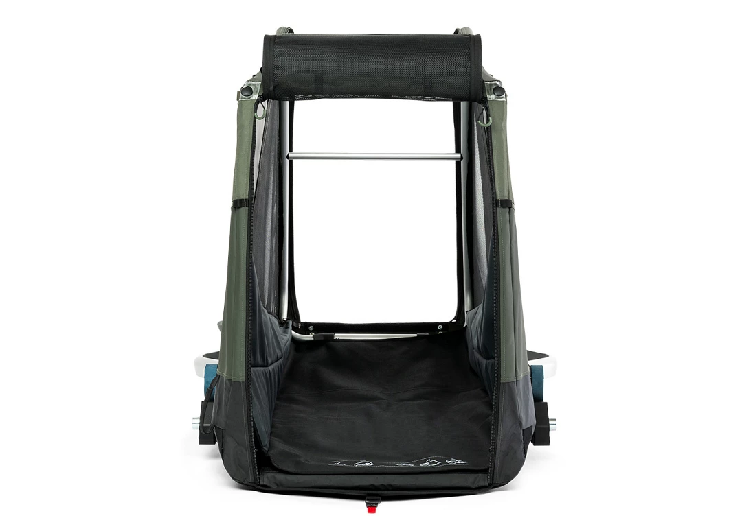 - Optimale ventilatie: de voor-, zij- en achterkant van de fietskar zijn voorzien van gaaspanelen voor een uitstekende ventilatie. Naast het zonnedak, kan ook het voorpaneel volledig worden open geritst.