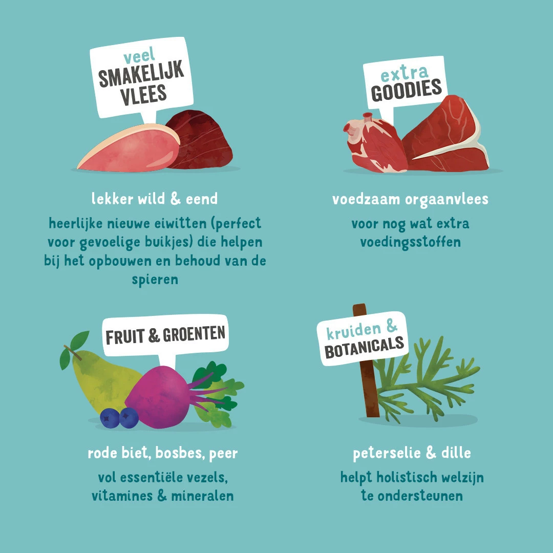 Samenstelling: wild 30%, eend 26%, mineralen, wortels 2%, bataten 1%, rode bieten 1%, cranberry’s 1%, appels 1%, peterselie 0,1%, dille 0,1%.