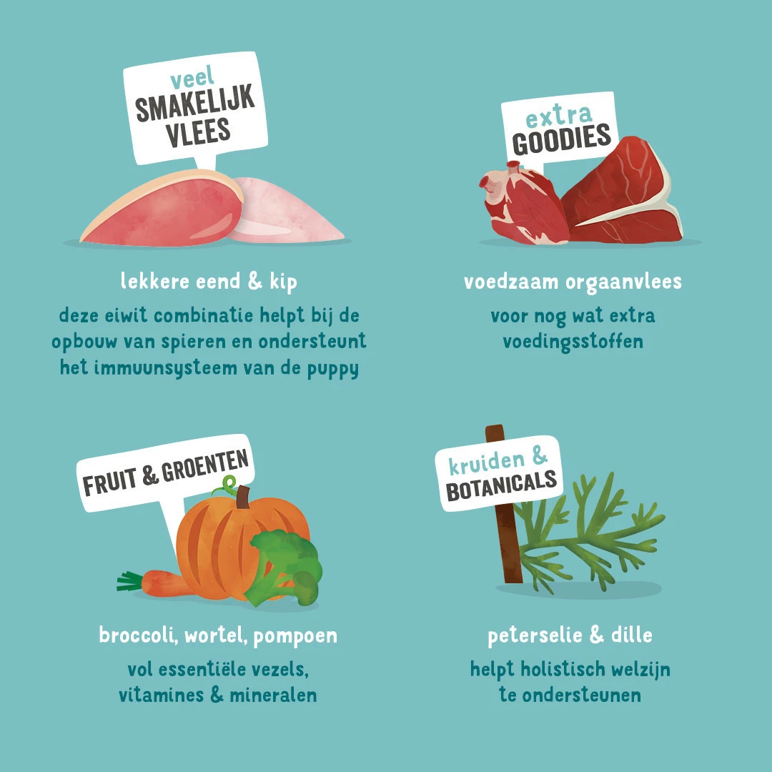 In Edgard & Cooper hondenvoer Puppy eend en kip worden heerlijke stukjes eend en kip gebruikt en absoluut geen bewerkte, overgare of gedroogde eend en kip of meel van eend of kip dat moeilijker is voor de buikjes om te verteren. Daarnaast wordt een supergezonde mix van fruit, groenten en kruiden toegevoegd.