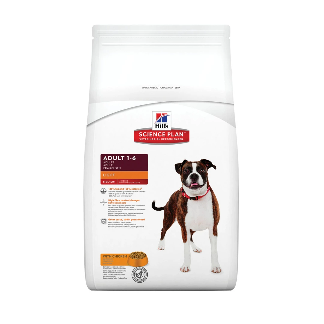 Hill’s Science Plan hondenvoer Adult Light Medium met kip voor een gebalanceerde voeding en gewichtscontrole. Met L-carnitine om een gezonde hartfunctie te bevorderen en hoogwaardige eiwitten voor een verzadigd gevoel tussen de maaltijden.