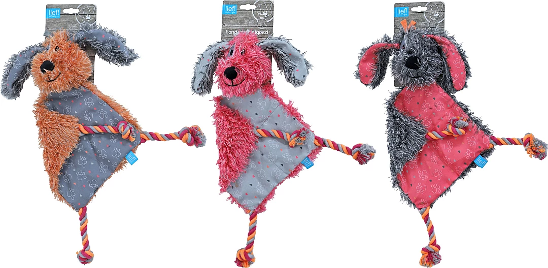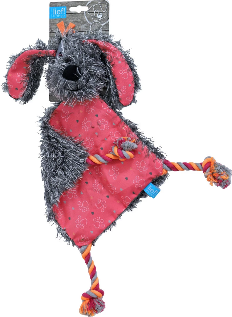 lief! lifestyle Girls Teckel Plat met Piep is een plat hondenspeeltje van stof en pluche. De knuffel heeft de vorm van een hondje en is afgewerkt met Girls details. De knuffel heeft floss-touw op 3 hoeken en een hondenkop waar een piepgeluid in is verwerkt, waardoor jouw hond of puppy er nog liever mee zal willen spelen!