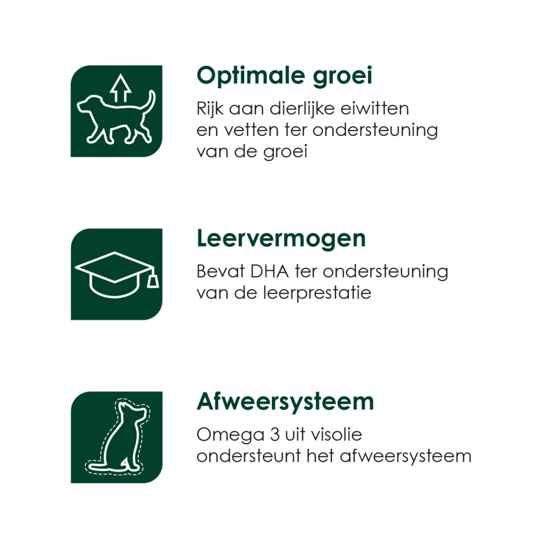 | Optimale groei Rijk aan dierlijke eiwitten en vetten ter ondersteuning van de groei. | |
