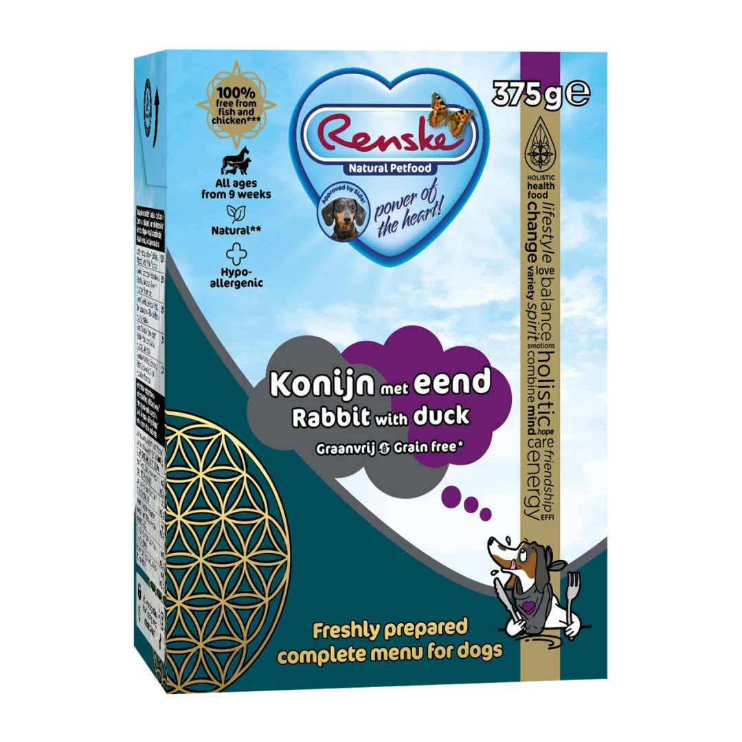 Renske vers bereide vleesmaaltijd konijn met eend is een complete, gluten- en graanvrije maaltijd voor jonge, volwassen en oude honden van alle rassen vanaf 9 weken. Het product bevat 60% vers bereid konijn met eend en is aangevuld met heerlijke groenten. Door de hoogwaardige ingrediënten zijn de maaltijden licht verteerbaar en goed voor moeilijke eters! In handige kleine porties verpakt, ook ideaal voor onderweg of op vakantie.