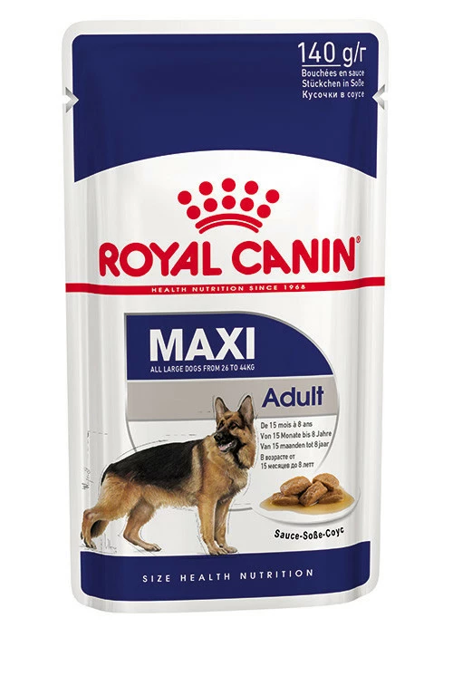 Royal Canin Maxi Adult Wet hondenvoer is een volledige natvoeding voor volwassen honden, van 15 maanden tot 8 jaar, van grote hondenrassen met een gewicht van 26 tot 45 kg.