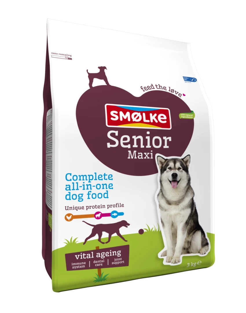 Smølke Senior Maxi is een complete Alles-in-één hondenvoeding afgestemd op de behoefte van grote honden vanaf ongeveer 6 jaar met een gewicht boven de 30 kg.