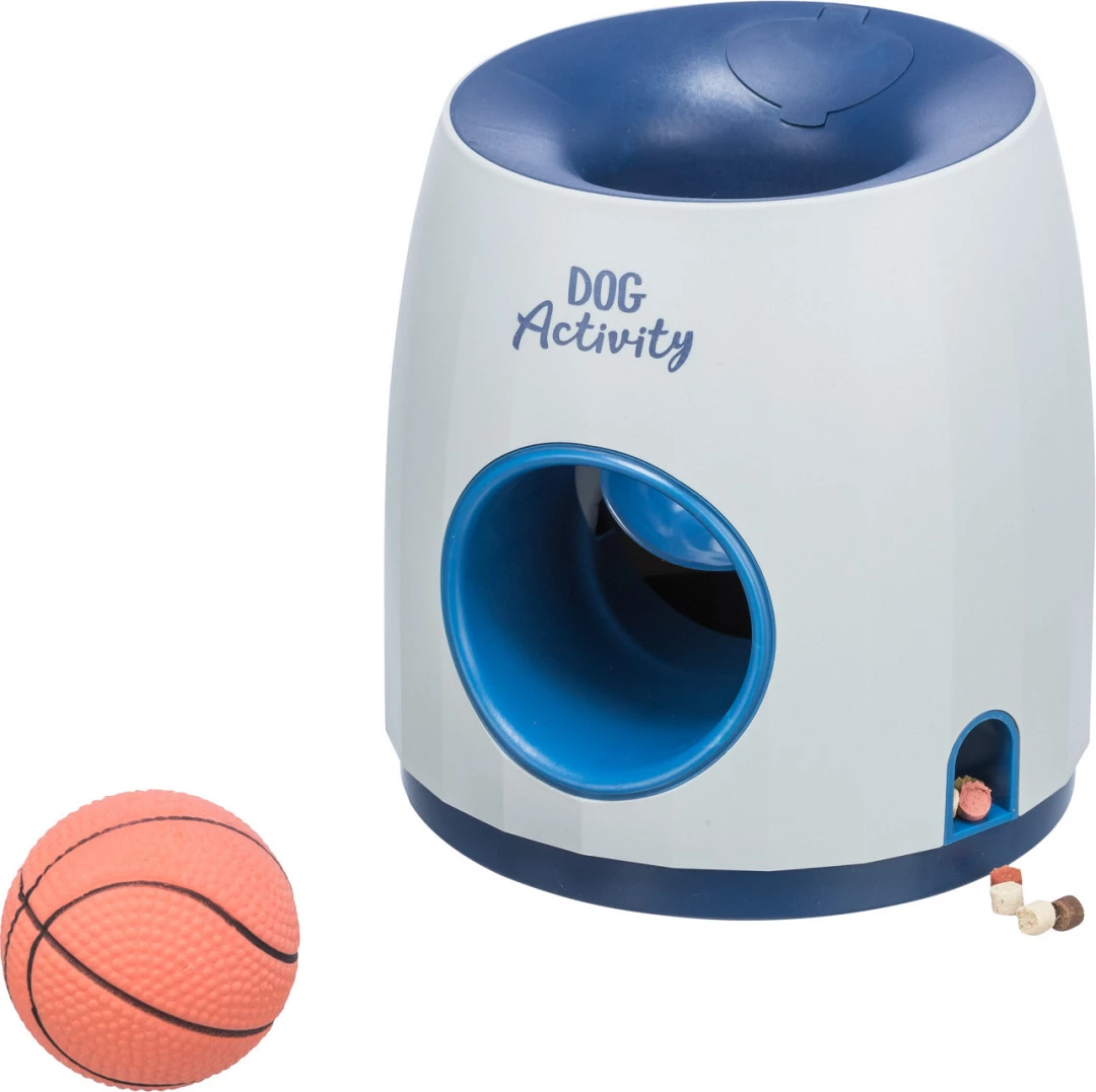 Daag je hond uit met Het TRIXIE strategiespel Dog Activity Ball & Treat. Dit is een mechanische snoepjesautomaat die je allereerst vult met kleine snacks naar keuze. Dan kan de training beginnen: nadat je de bal hebt gegooid, moet jouw hond hem in de opening van het speeltje leggen en wordt hij beloond met traktaties die automatisch uit het apparaat vallen.