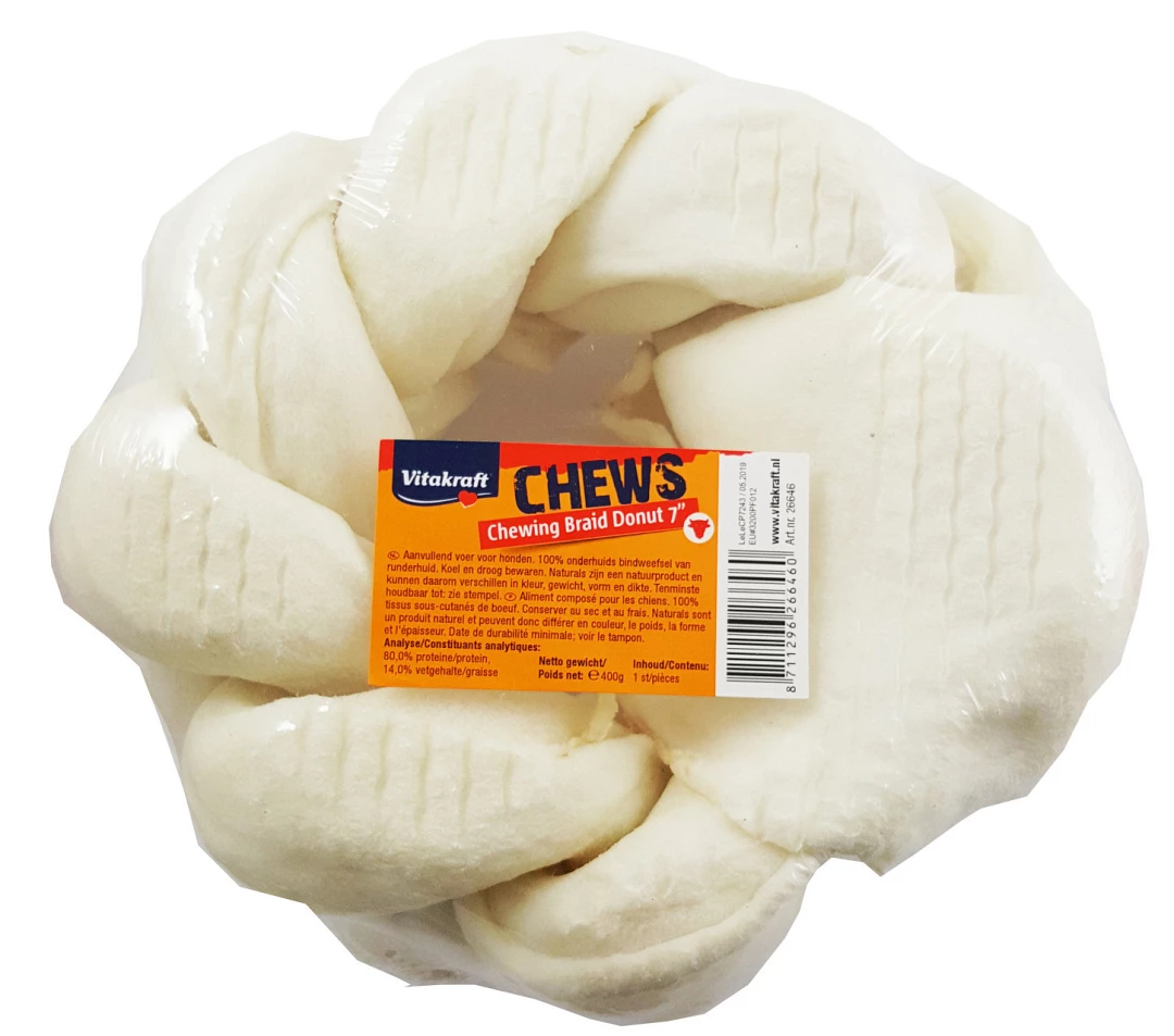 Het Vitakraft Chews assortiment bestaat uit een collectie witte kauwbotten gemaakt van 100% gedroogd onderhuids bindweefsel van runderhuid (de tweede stevige en taaie laag van de huid).