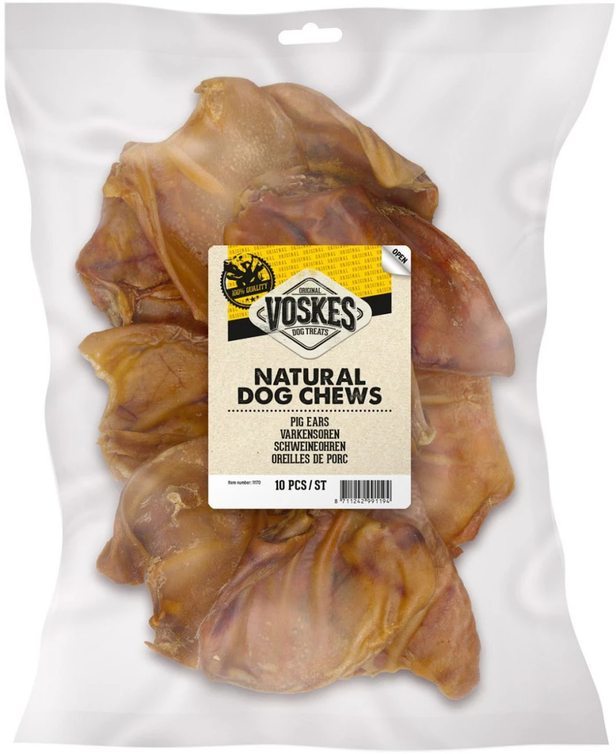 Voskes varkensoren zijn natuurlijke kauwsnacks voor lang kauwplezier van de hond. Deze snack van gedroogd varkensvlees is 100% natuurlijk, luchtgedroogd, gerookt en vrij van toevoegingen.