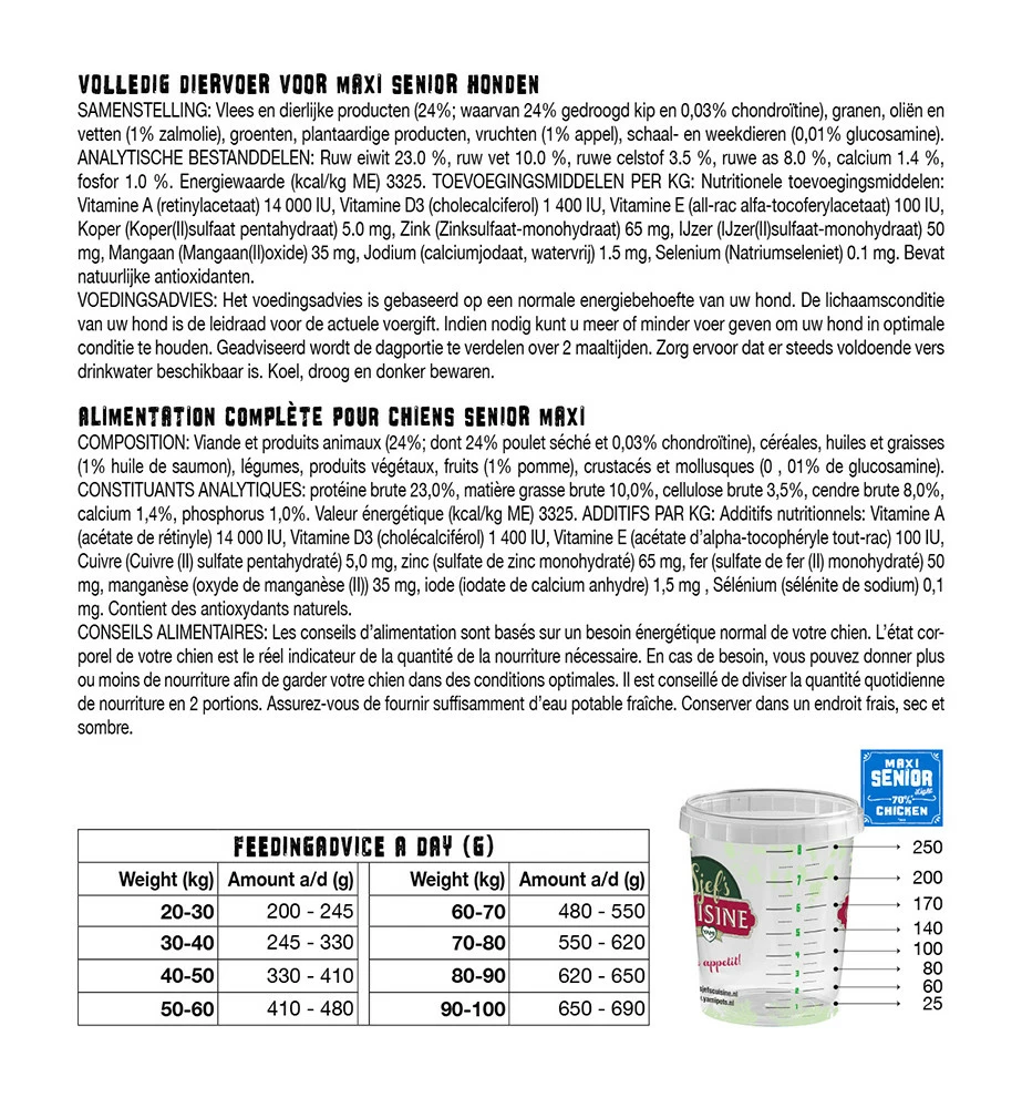Yamipets Sjef’s Cuisine hondenvoer Maxi Senior wordt geadviseerd voor oudere honden van de grotere hondenrassen. De natuurlijke antioxidanten en een hoog gehalte vitamine E dragen bij aan het tegengaan van celveroudering. De toegevoegde vitaminen- en mineralenmix is speciaal ontwikkeld en zorgt voor alle noodzakelijke voedingsstoffen voor de oudere hond.