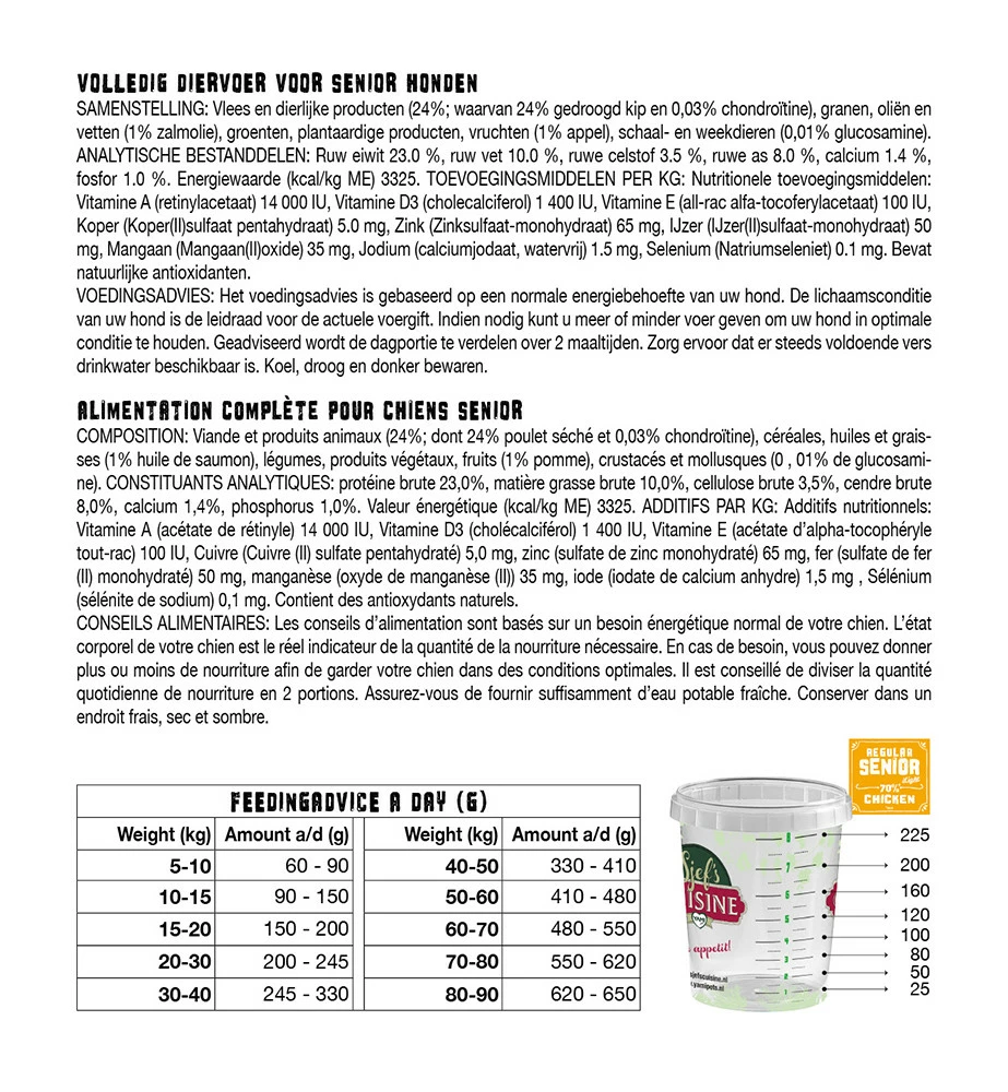 Yamipets Sjef’s Cuisine hondenvoer Regular Senior is speciaal ontwikkeld voor oudere honden van alle kleine en middelgrote rassen. Door het verlaagde energieniveau helpt de Senior voeding overgewicht voorkomen. De uitgebalanceerde samenstelling van de senior brokjes met kip, rijst en fruit draagt bij aan de optimale conditie van honden ouder dan 8 jaar.
